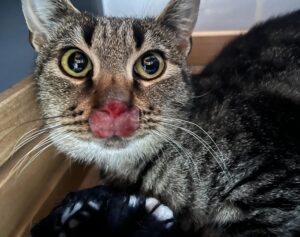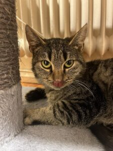 Elsy är en kattflicka som kom in i oktober 2025 efter att hon hittats rädd och mager ute. Hon finns nu i katthuset i Pärup, Hörby.